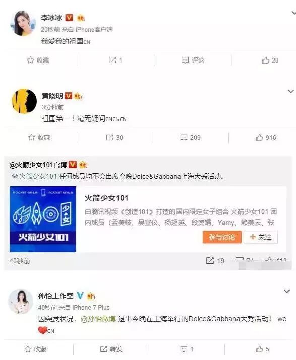 再比如“D&G辱华”事件爆发后,大家都很亢奋。一时间,几乎所有人都在抨击D&G的行为,很多明星也自觉发起了抵制D&G的行动。