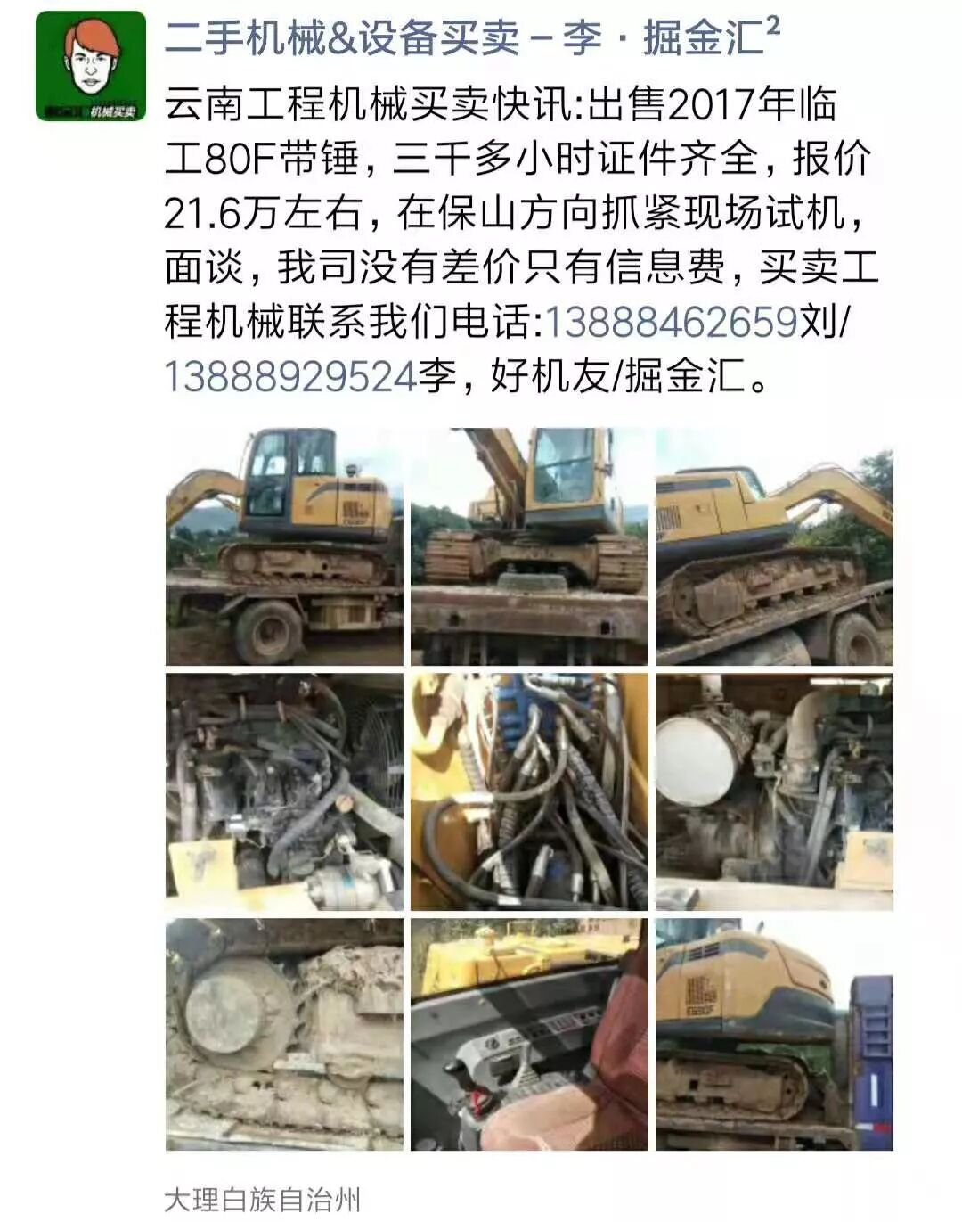 出售2017年临工80F带锤,三千多小时证件齐全,报价21.6万左右,在保山方向抓紧现场试机