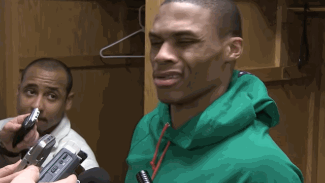 威少在采访中说“啥?”的那个时刻。这流露出了他在被问到一些毫无根据、无关紧要的问题时所感到的疲惫。这种反应纯真而又诚挚,同时也突出了赛后采访是多么的琐碎而多余。