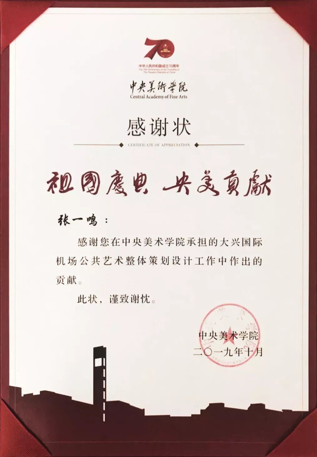 ▲中央美术学院授予的奖杯
