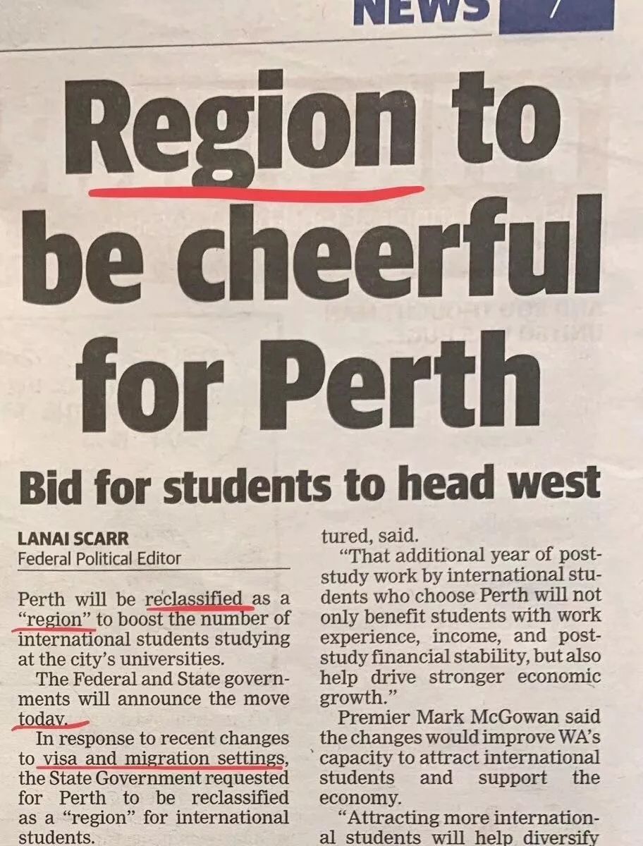 根据文件内容确定珀斯将不再被划分为主要城市,这一计划将于11月16日起正式生效,而这也就意味着更多的技术移民将可以在珀斯定居和工作啦