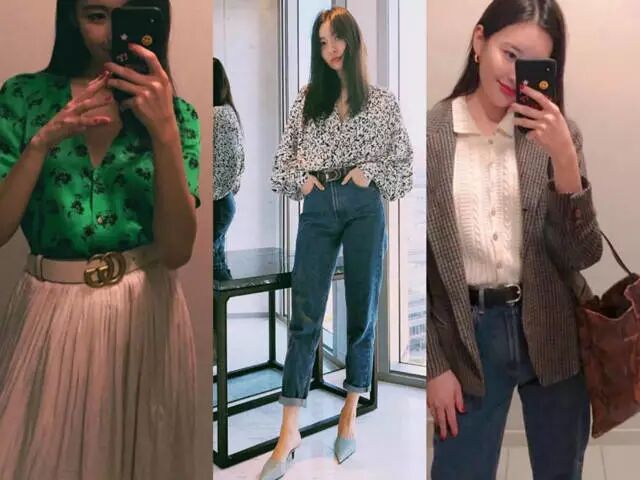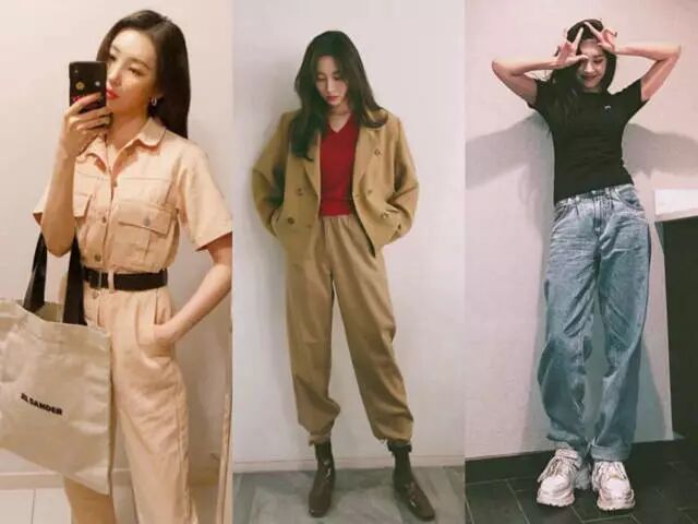 虽然李宣美天生比例过人,但也绝不 “瞎穿”,即使穿着上面那种毫不显身材的“工装”,也会在腰部多加一条腰带,完善下比例。