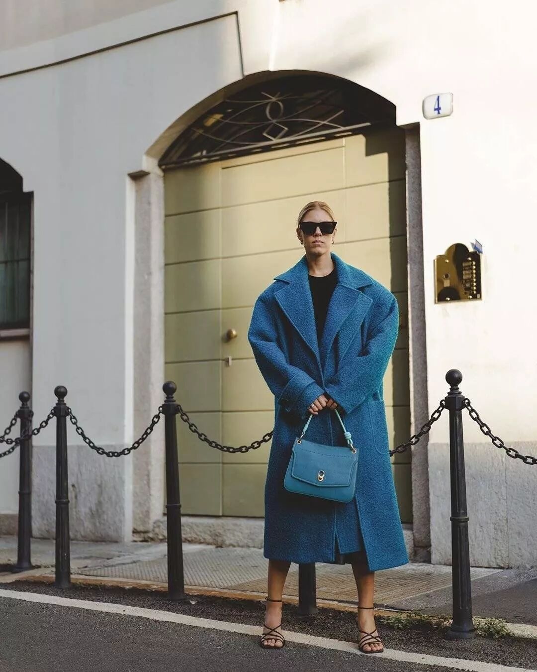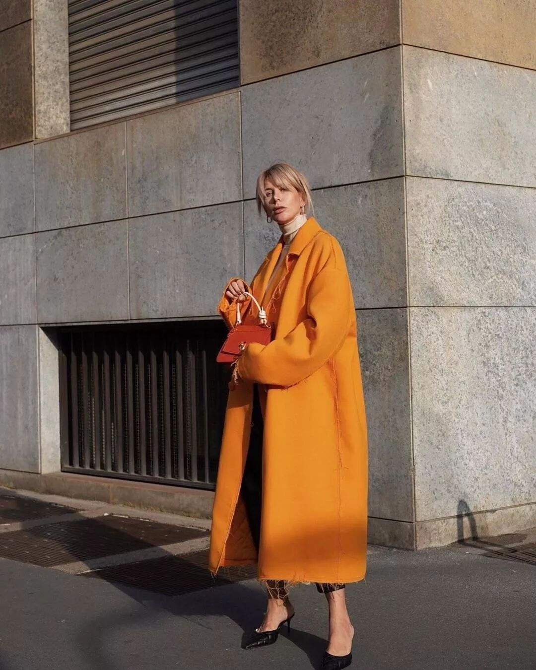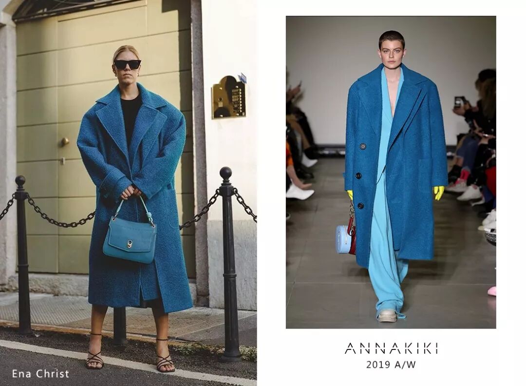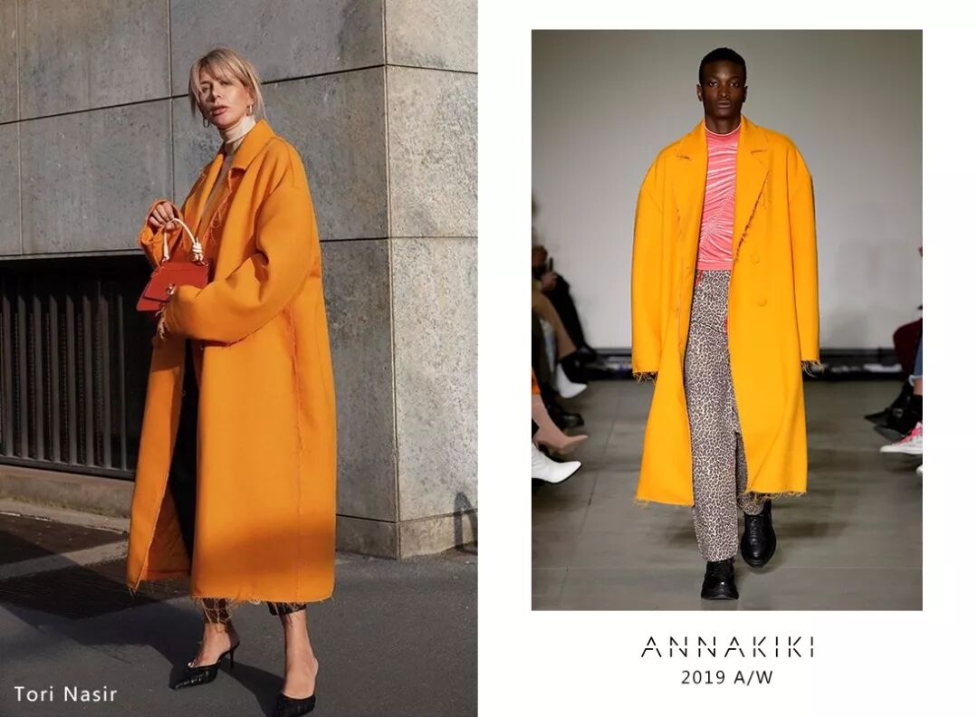 意大利时尚博主 Tori Nasir身穿ANNAKIKI2019A/W米兰时装周走秀款精纺羊毛毛边廓形大衣,亮眼色彩和大廓形设计穿出超强气场!