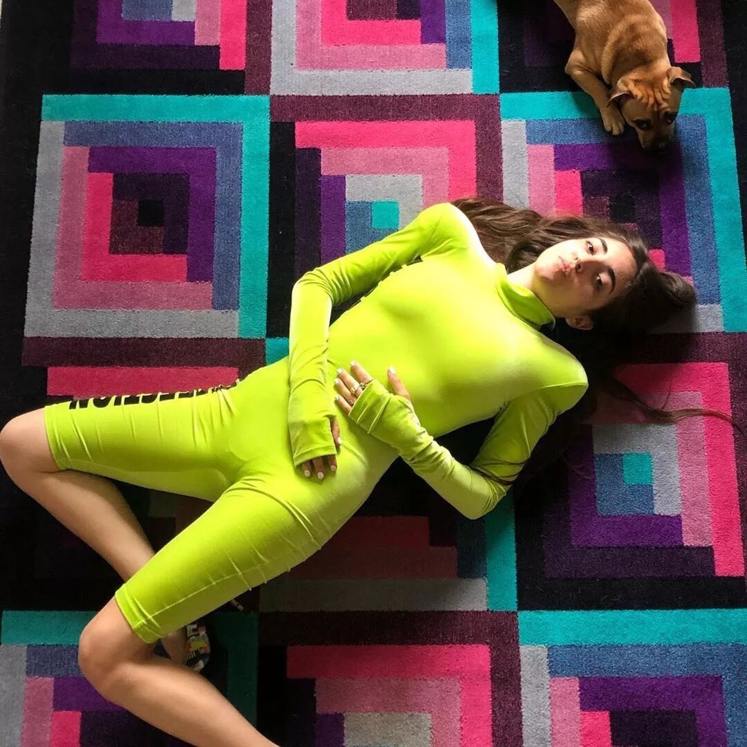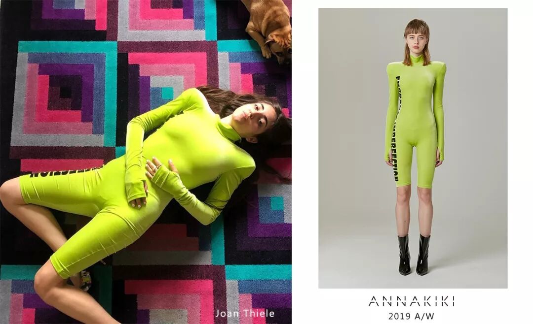 意大利歌手 Joan Thiele身穿ANNAKIKI2019A/W米兰时装周走秀款丝绒小高领连体单车裤,时髦垫肩与亮眼荧光绿轻松展现时髦态度!