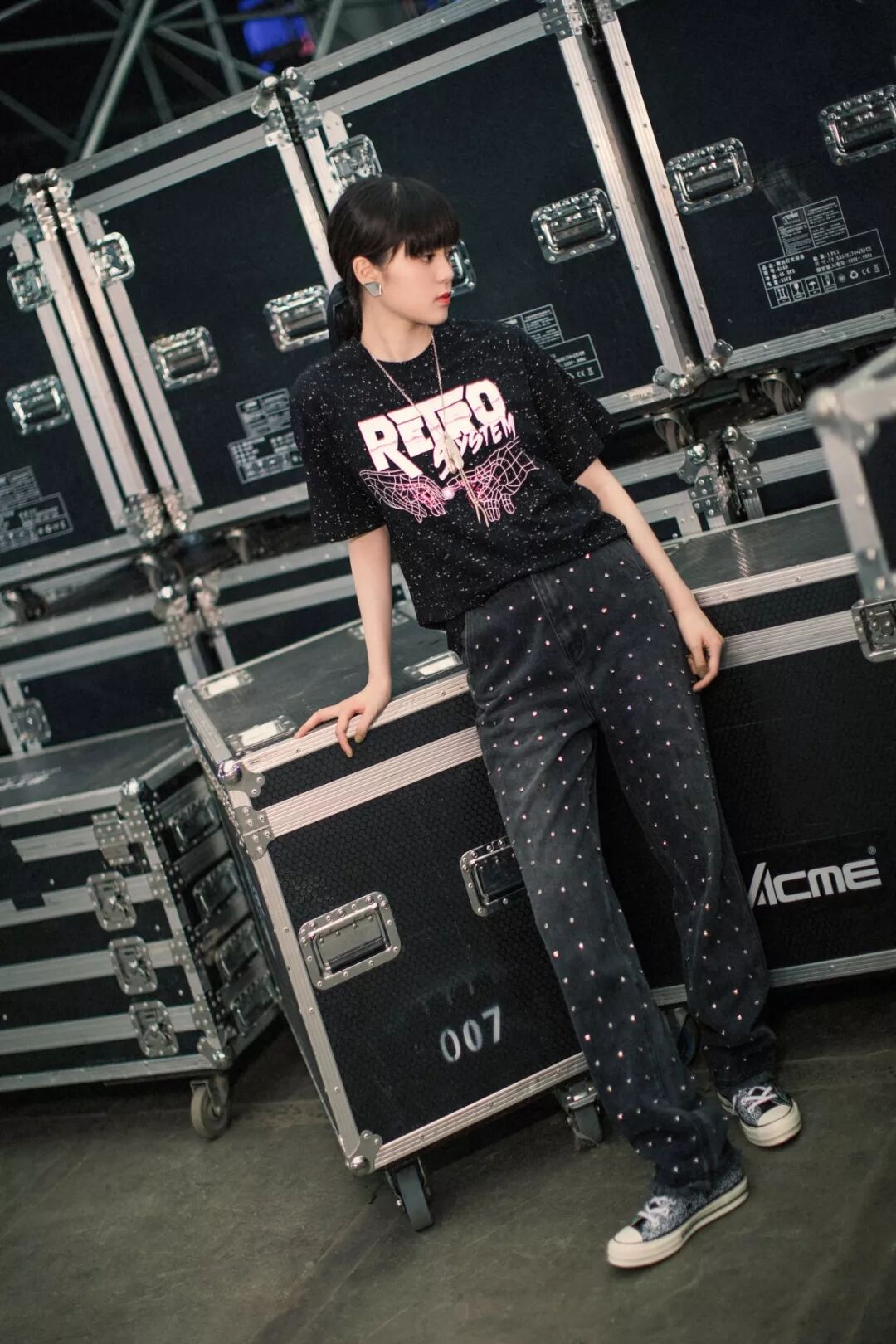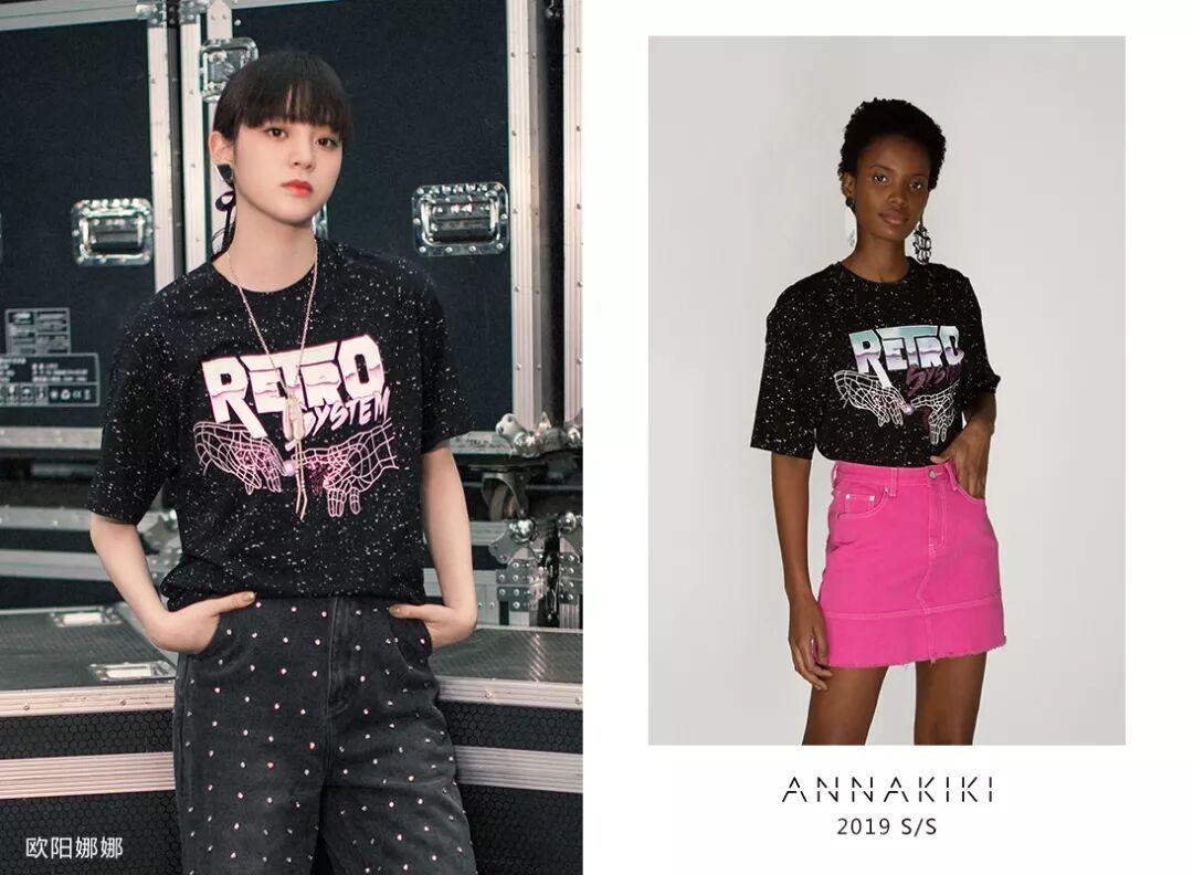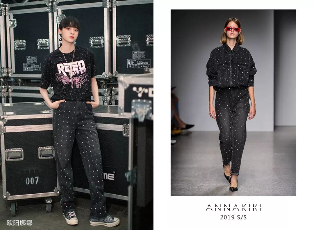 欧阳娜娜身穿ANNAKIKI2019S/S摇滚印花T恤搭配米兰时装周走秀款手工钉钻牛仔,充满活力的甜酷娜比展现不一样的帅气style!