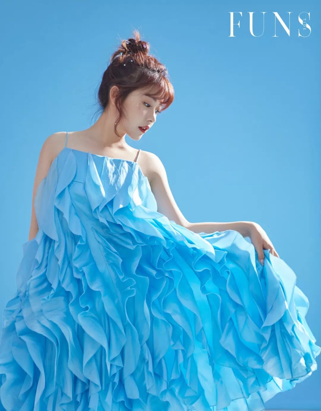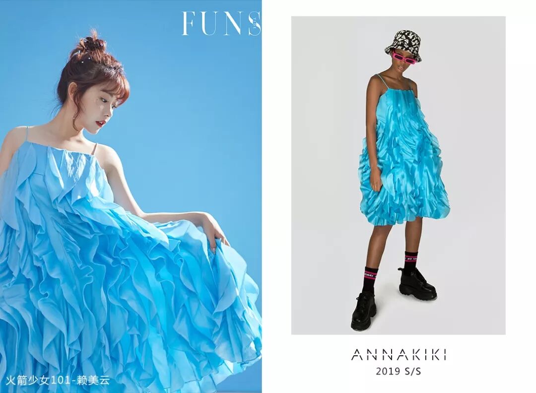 火箭少女101-赖美云身穿ANNAKIKI2019S/S真丝荷叶边对丝礼服裙拍摄时尚大片,飘逸的真丝荷叶边将少女的灵动俏皮展现得恰到好处!