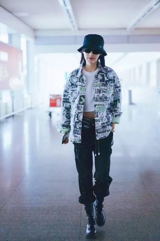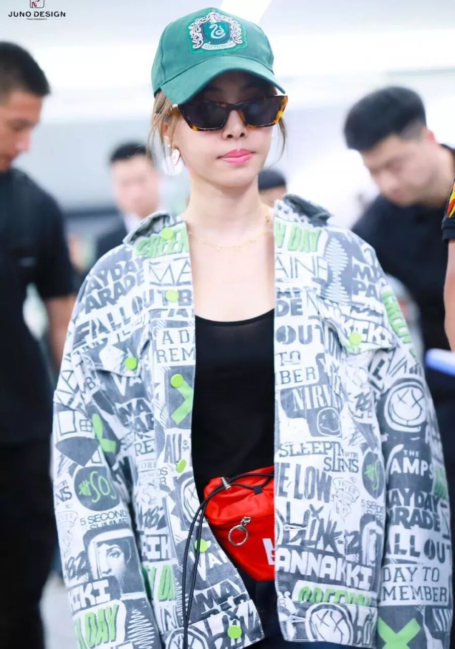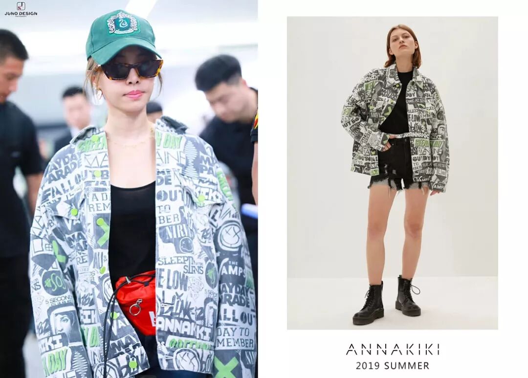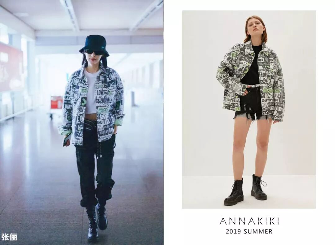 张俪身穿ANNAKIKI2019S/S涂鸦印花牛仔外套现身机场,Oversize涂鸦外套点亮工装穿搭,演绎甜酷女孩的率性自然!