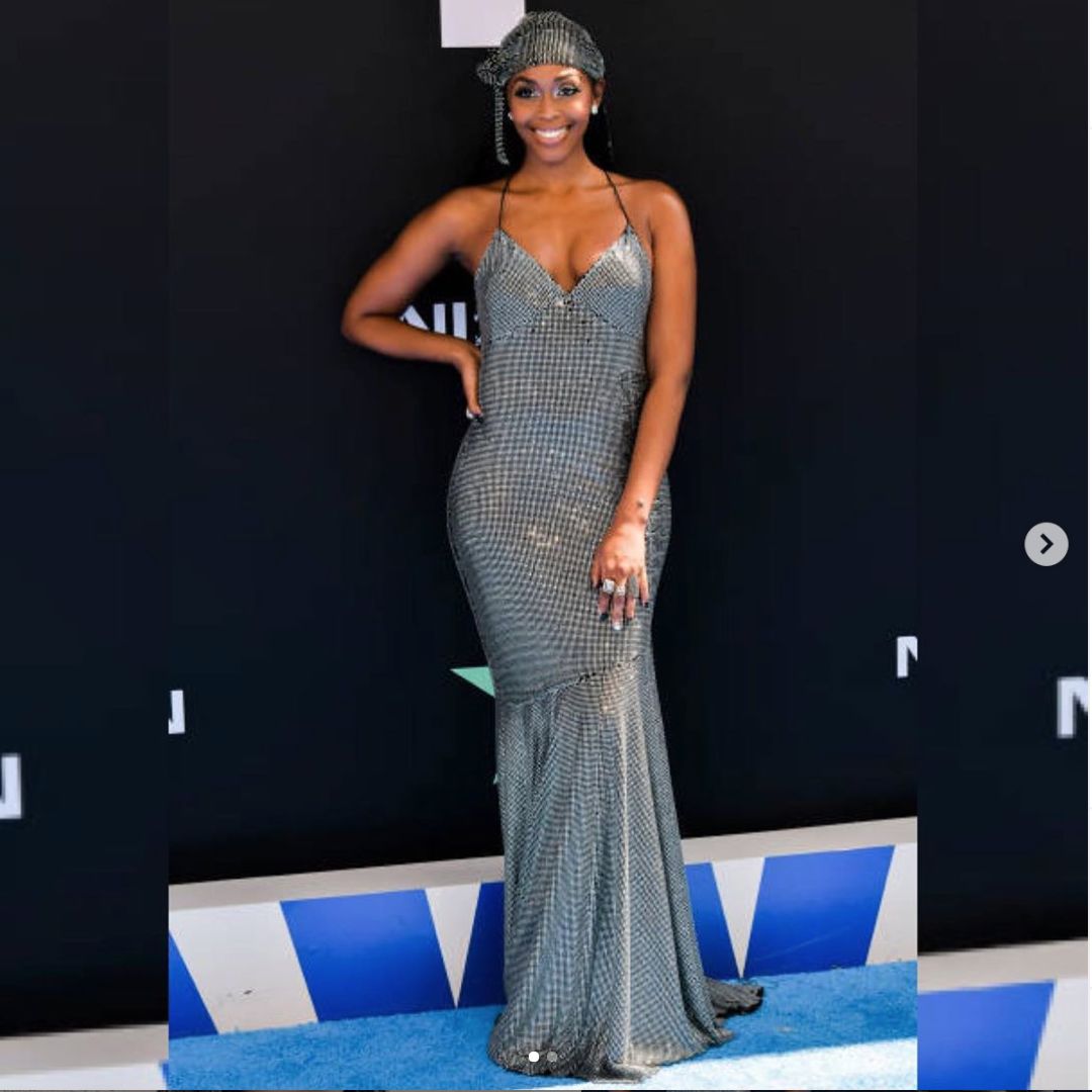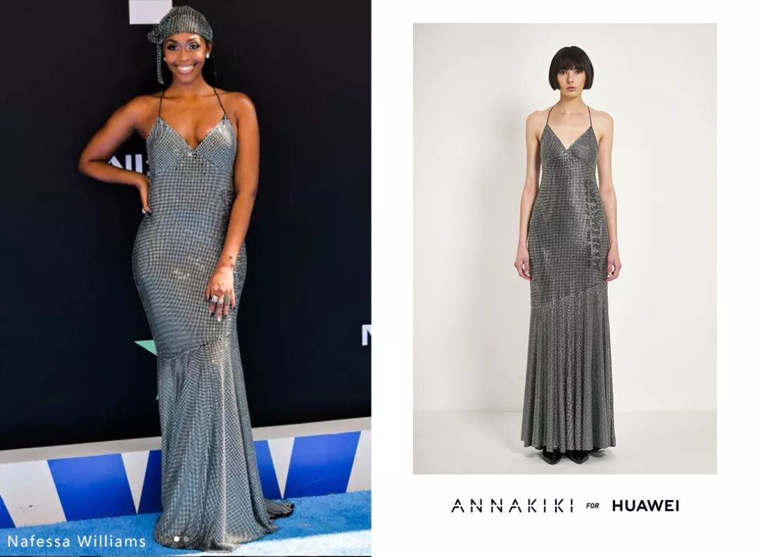 美国演员Nafessa Williams 身穿ANNAKIKI FOR HUAWEI全手工烫钻礼服裙出席BETA Awards,V领鱼尾裙设计让整体造型大方奢华,精致迷人!