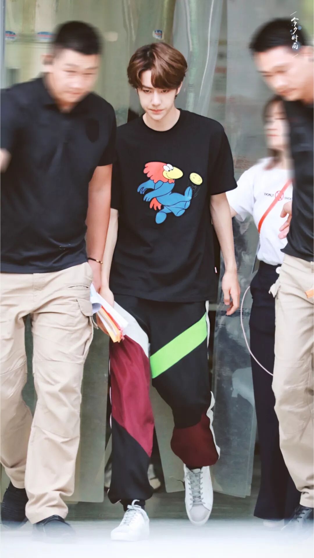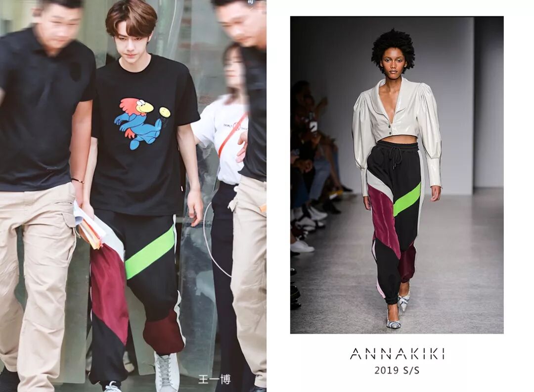 王一博身穿ANNAKIKI2019S/S米兰时装周走秀款撞色拼接抽绳运动裤录制节目,裤子上的拼接撞色设计打破常规、轻松点亮整体造型!