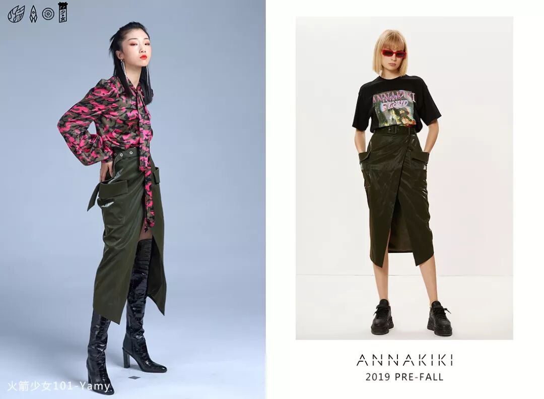 火箭少女101-Yamy身穿ANNAKIKI 2019 PRE-FALL迷彩印花真色衬衫搭配立体剪裁一步裙彰显率性洒脱,更显复古个性!
