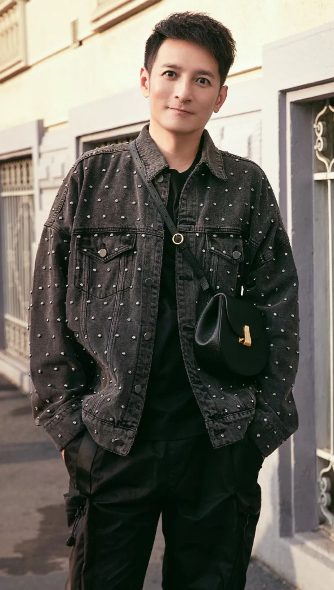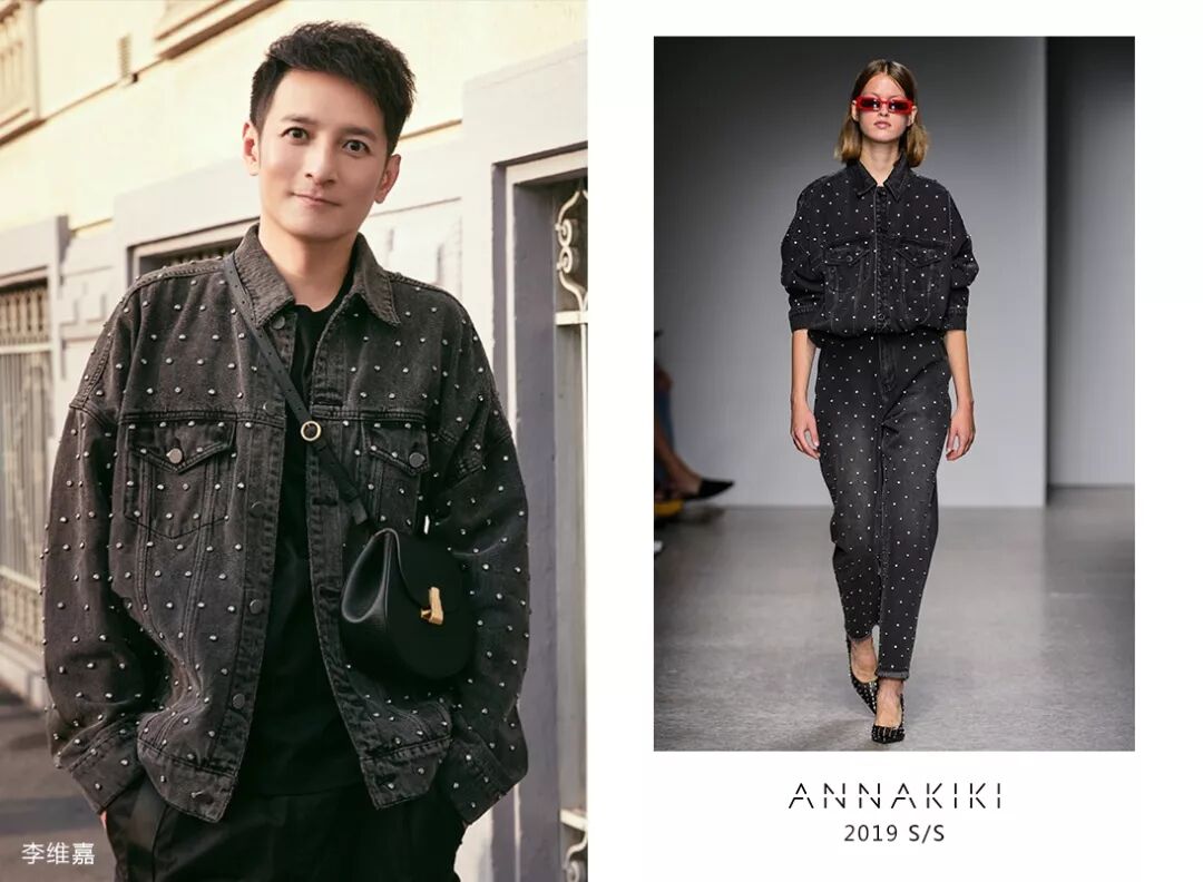李维嘉身穿ANNAKIKI 2019S/S米兰时装周走秀款手工钉钻牛仔外套,前卫酷味中彰显华丽感,闪亮钉钻融合硬朗牛仔解锁超酷感穿搭!