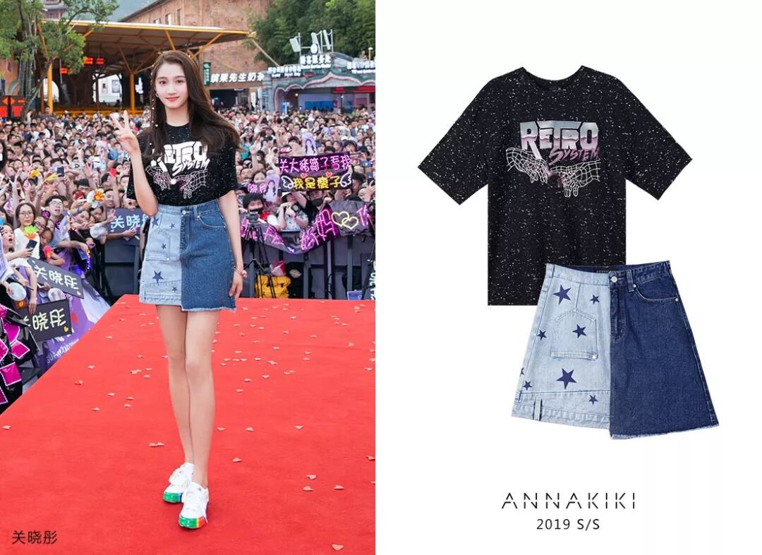 关晓彤身穿ANNAKIKI 2019S/S摇滚印花T恤、不对称星星半裙出席横店见面会,酷感T恤把玩时髦态度,元气满分的星星半裙清新甜美!