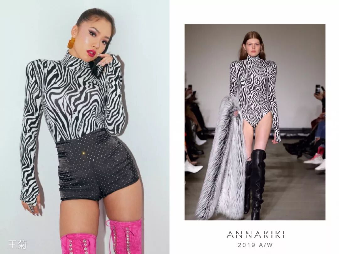 王菊身穿ANNAKIKI 2019A/W米兰时装周走秀款斑马纹连体衣,复古时髦且极富搭配趣味性的宽肩斑马纹迸发野性力量,欧美范十足!