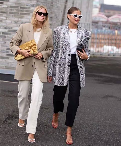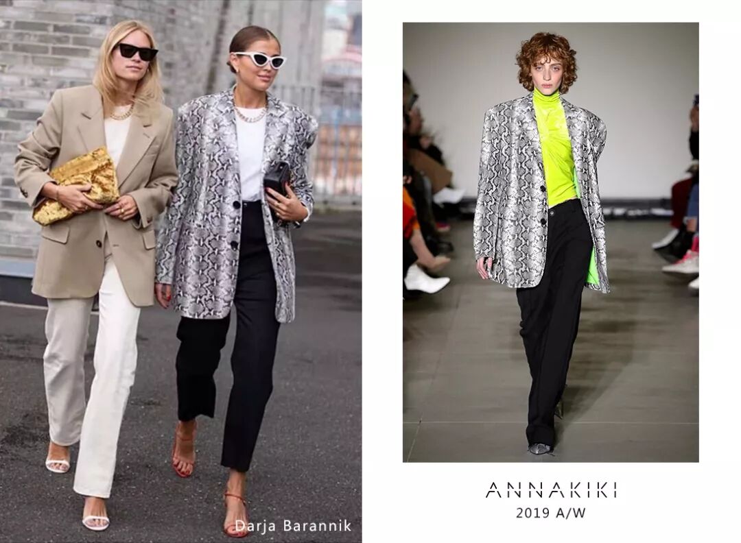 意大利时尚博主Darja Barannik身穿ANNAKIKI2019A/W米兰时装周走秀款蛇纹西装外套,大热的动物纹元素让十足个性发挥到极致!