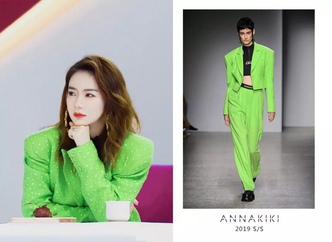 戚薇身穿ANNAKIKI 2019S/S米兰时装走秀款烫珠西装短外套、削肩背心及精纺羊毛松紧阔腿裤录制节目,霸气戚哥完美hold住醒目未来感荧光绿!