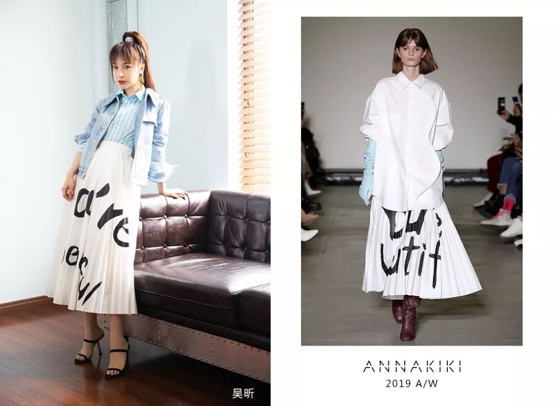 吴昕身穿ANNAKIKI2019A/W米兰时装周走秀款手写体印花压褶半裙,手写体Slogan抢眼入镜,简约黑白彰显独特魅力!