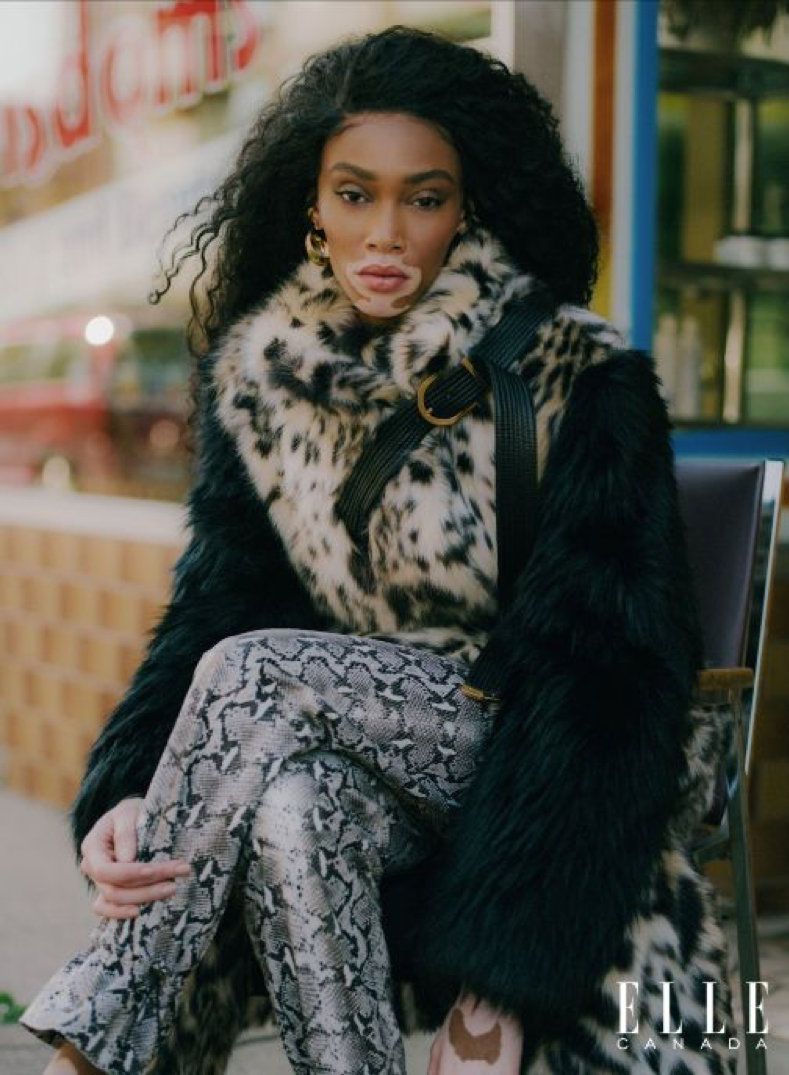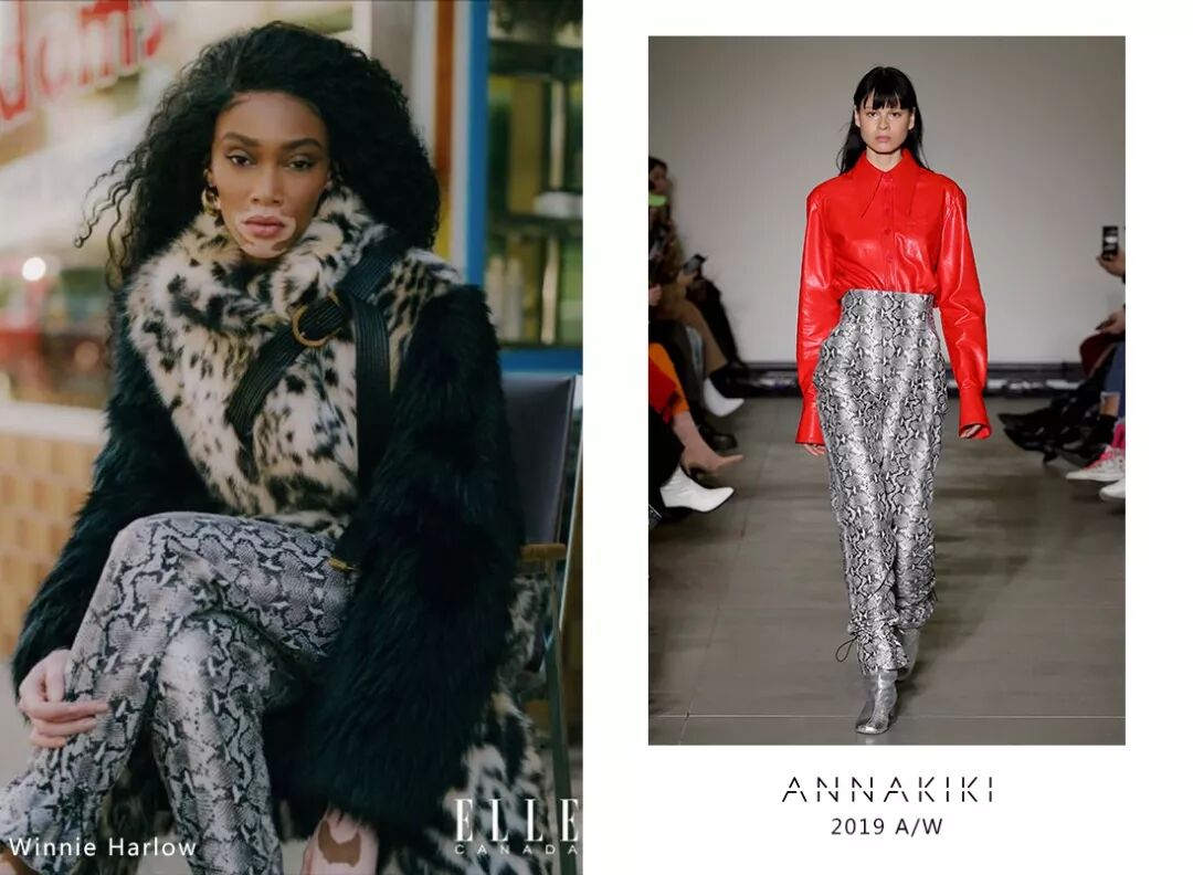 国际超模Winnie Harlow身穿ANNAKIKI 2019A/W蛇纹高腰长裤演绎加拿大版《ELLE》时尚大片,以野性动物纹释放不完美的率真态度!