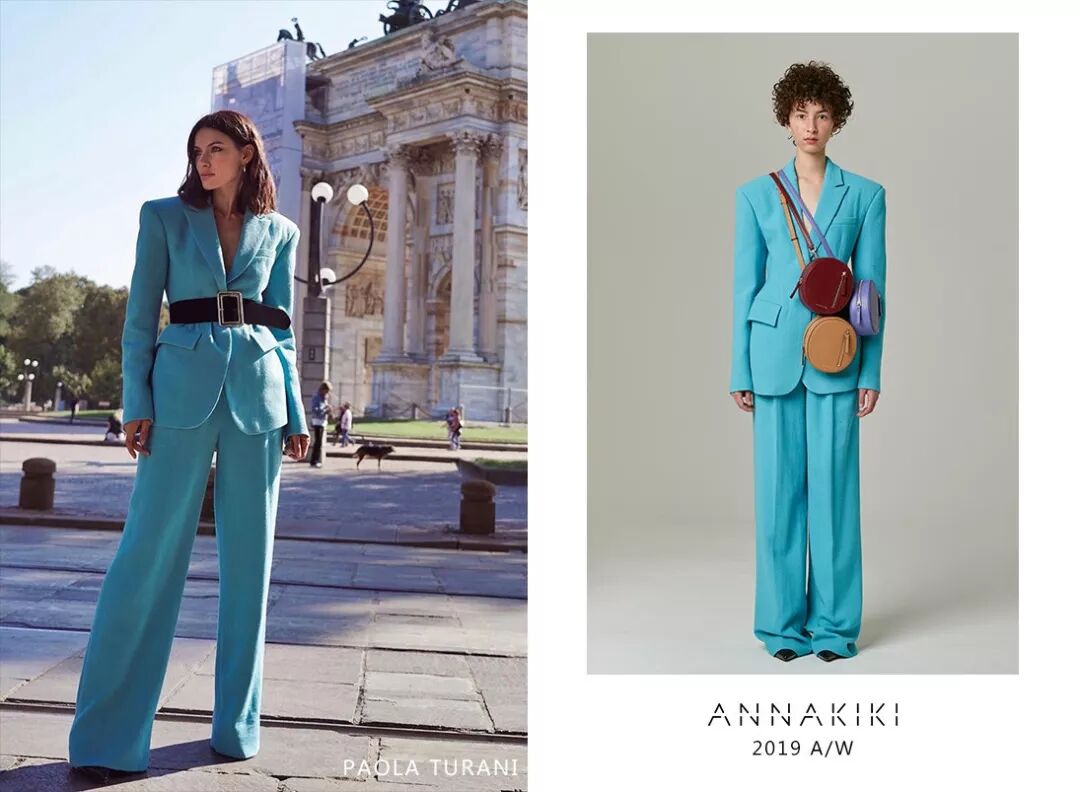 意大利超模Paola Turani身穿ANNAKIKI2019A/W米兰时装周走秀款精纺羊毛西装外套&长裤套装,清新的湖蓝色打破冬季的沉闷!