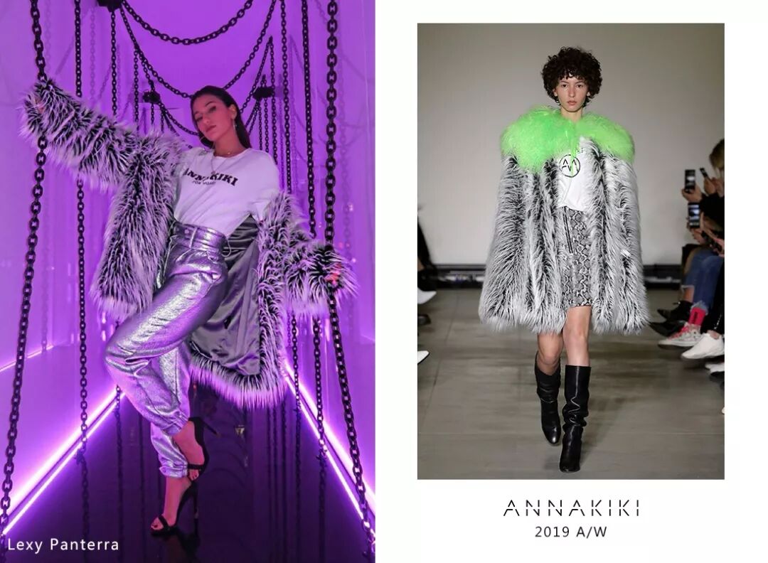 美国歌手Lexy Panterra身穿ANNAKIKI2019A/W米兰时装周走秀款皮草外套,黑白间色长毛面料蓬松柔软,宽肩H型廓形在保暖同时塑造超强气场!