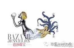 人鱼精灵手托明珠,身体用异形珍珠来代替,尾部似浪花,密镶多层蓝宝石。这么一个充满西方宫廷美学线条的作品,勾勒的却是传统昆曲剧本《追鱼记》中鲤鱼精的造型。不得不让人感叹龙梓嘉的天马行空。