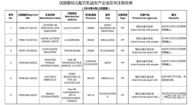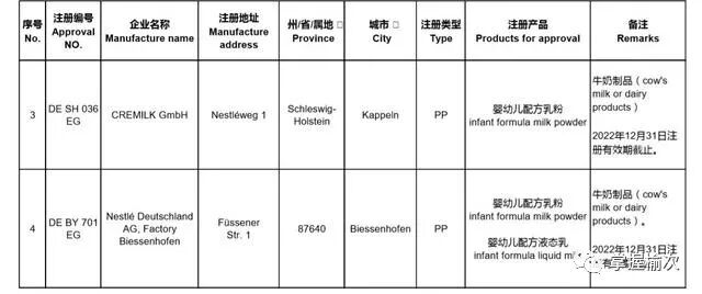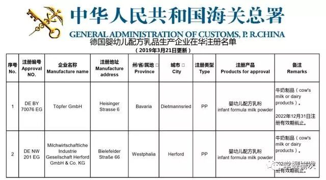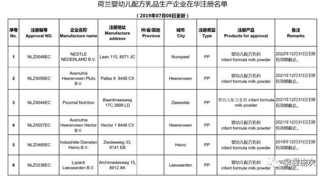 根据中国的监管政策,凡是在中国线下市场进行公开销售的进口婴幼儿配方奶粉,其所属工厂必须先从中国认监委进行备案注册,并且其产品要通过中国市场监督管理总局的配方注册。根据国家海关总署发布的名单,德国、法国和荷兰在中国认监委进行境外生产企业在华注册的奶粉工厂共计29个,分别是: