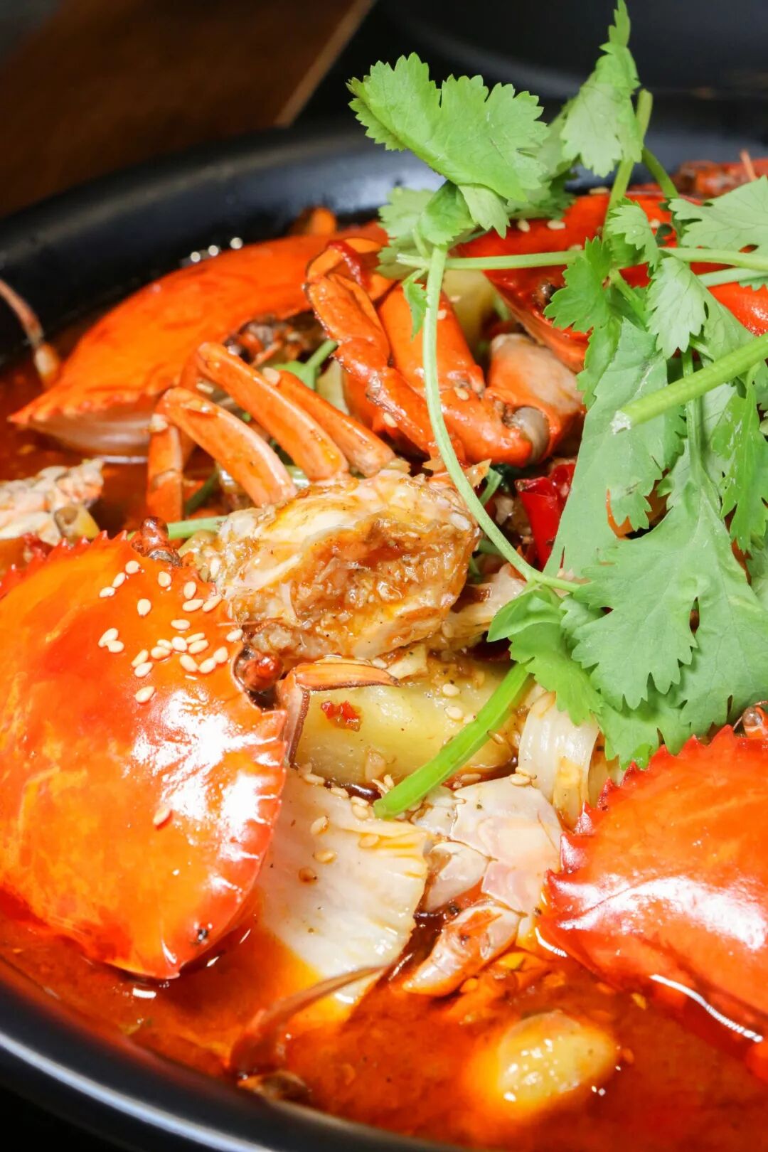 鲜活香蟹以洋葱为搭配,汤汁充分浸透蟹肉,葱香蟹鲜,肉质超饱满!
