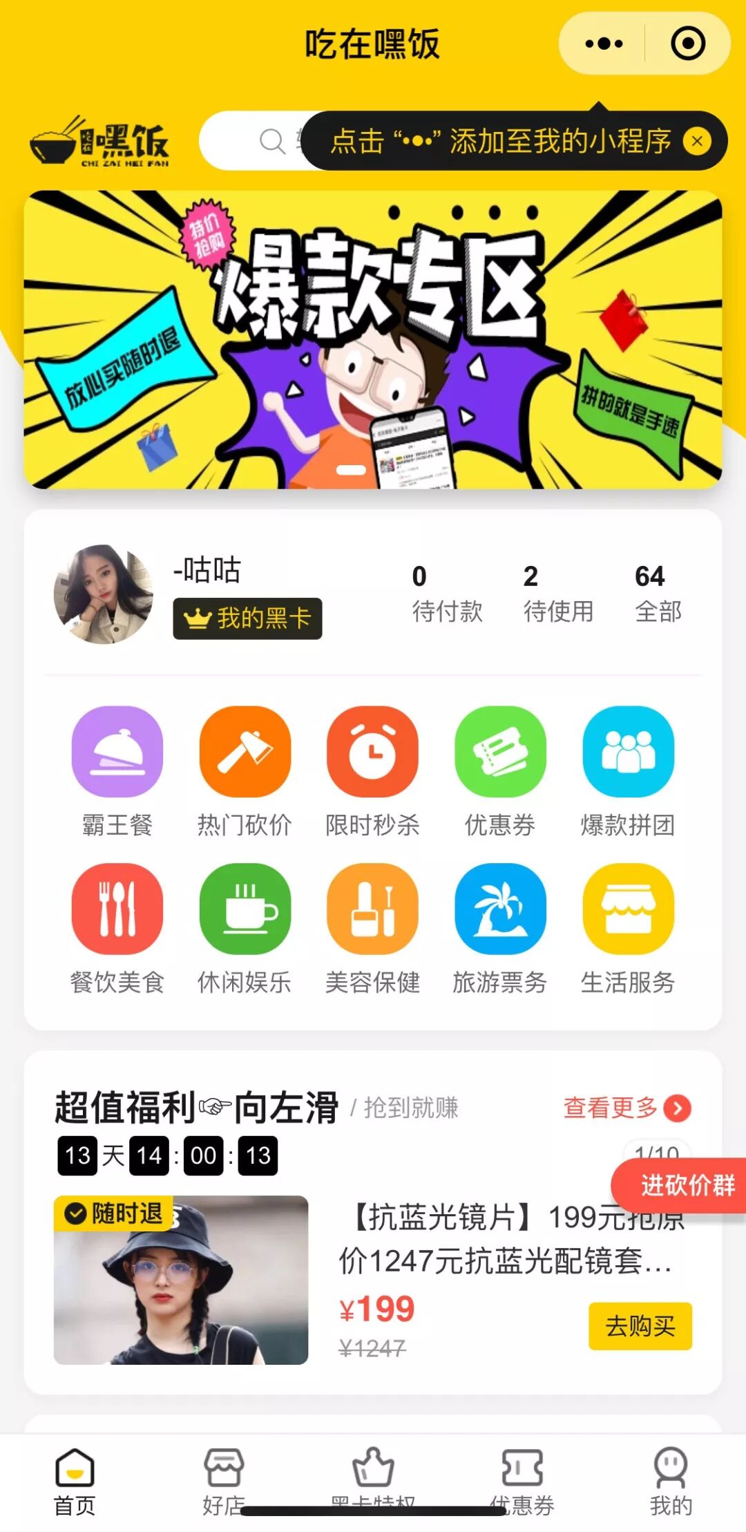 嘿饭平台是什么嘿饭是一个集本地吃喝玩乐购于一体的城市生活方式平台,为用户推荐同城美食、周边游玩、团购特惠、休闲娱乐、吃喝玩乐等生活消费福利信息。截止目前,嘿饭用户已超过200万+。