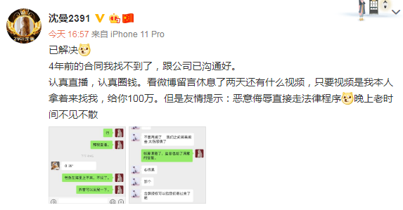 沈曼2天前宣布退网,疑似受到了娱加公会的不公,表示江湖再见,归期未定。直播前还跟鸽宝念叨着跟娱加续约吃亏了,如果到现在还不签约最少多赚两百万,而且虎牙都放话了,七百万还包打官司,看来是准备大面积进攻YY主播了。今天发微博表示回归,跟娱加的事已经解决了,当年老鱼答应他每年给沈曼100万签约费,也找不到合同,应该是画饼了,不知道这次娱加给出了什么让步,宣布直播,而且之前说授权合同在手里压着呢,也同意邮寄给总部了。
