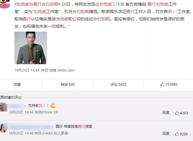 在此消息一经扩散,就有媒体在第一时间去求证嘉行传媒的工作人员,后来经过证实,微博更名的主要原因是因为刘恺威与嘉行传媒的合约已经到期了,并且不准备再续约。对方还表示到:虽然没有续约,不过我们始终回事很好的朋友,同时也祝福他在未来一切顺利。在解约后,一些来自网友的祝福也开始了,不断的有粉丝说到:“恭喜,恭喜。脱离狼窝”、“期待未来更好的你们!我们一路相随”等等一些祝福的话语。