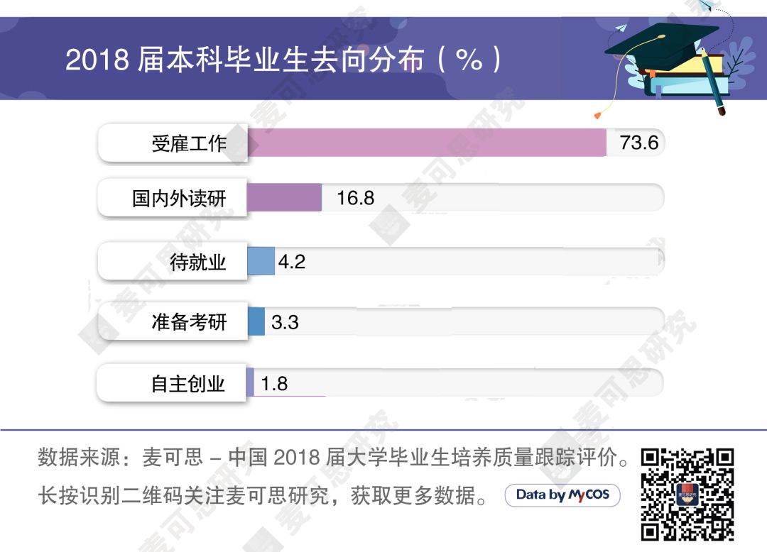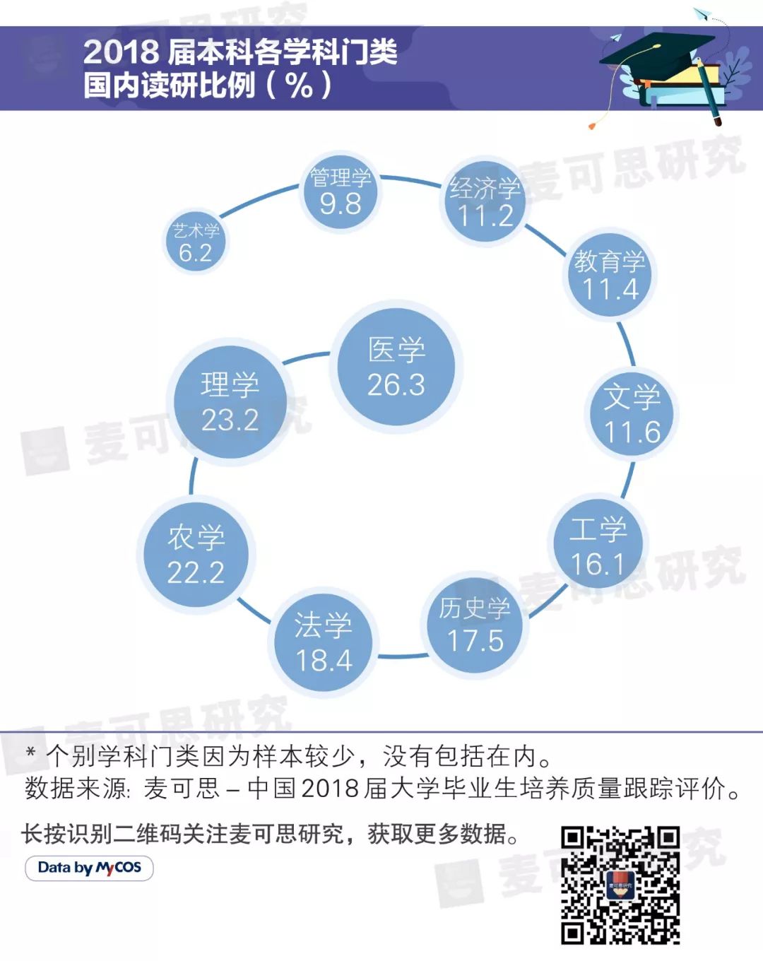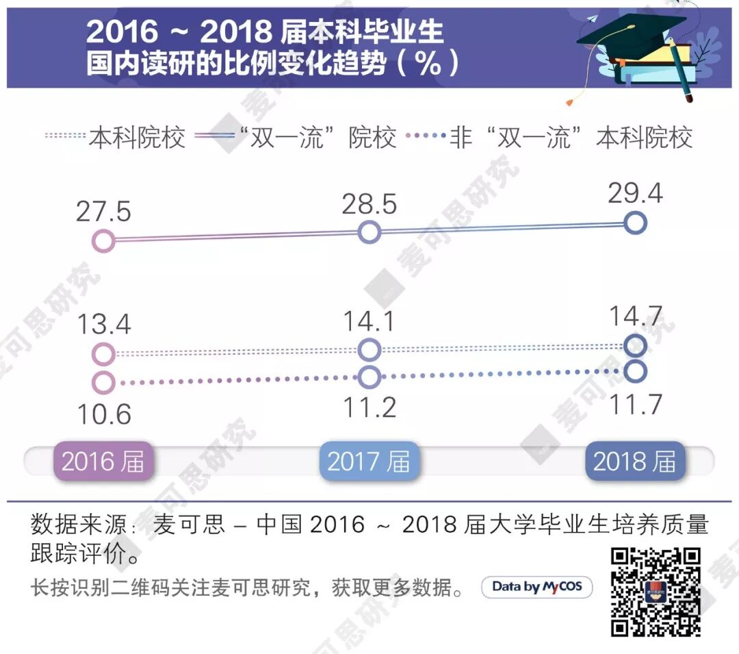 麦可思数据显示,16.8%的2018届本科生毕业后选择深造读研。具体来看,2.1%的毕业生选择出国读研;14.7%的毕业生在国内读研,该比例比2017届(14.1%)高0.6个百分点,比2016届(13.4%)高1.3个百分点。其中,“双一流”院校2018届毕业生中选择国内读研的比例为29.4%,非“双一流”本科院校2018届毕业生中选择国内读研的比例为11.7%。从本科学科门类来看,医学类毕业生国内读研比例最高,为26.3%;第二位是理学类,为23.2%。