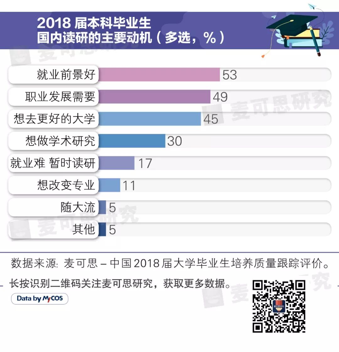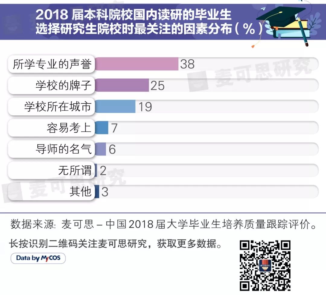 麦可思数据显示,2018届本科毕业生国内读研的主要原因是硕士研究生就业前景好(53%)和职业发展需要(49%)。读研人群选择院校时最关注的因素是所学专业的声誉(38%)和学校的牌子(25%)。