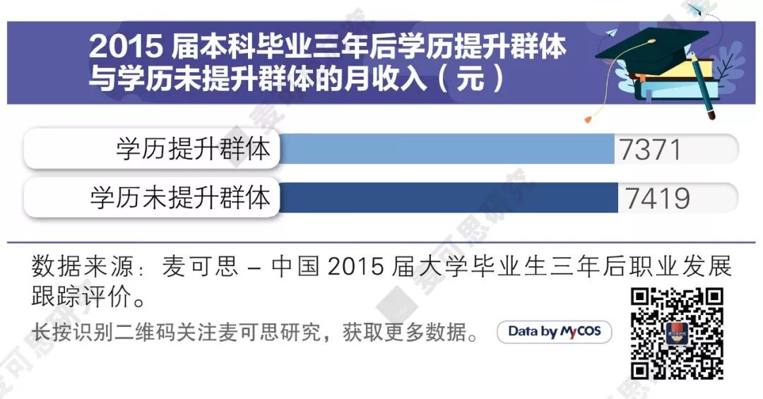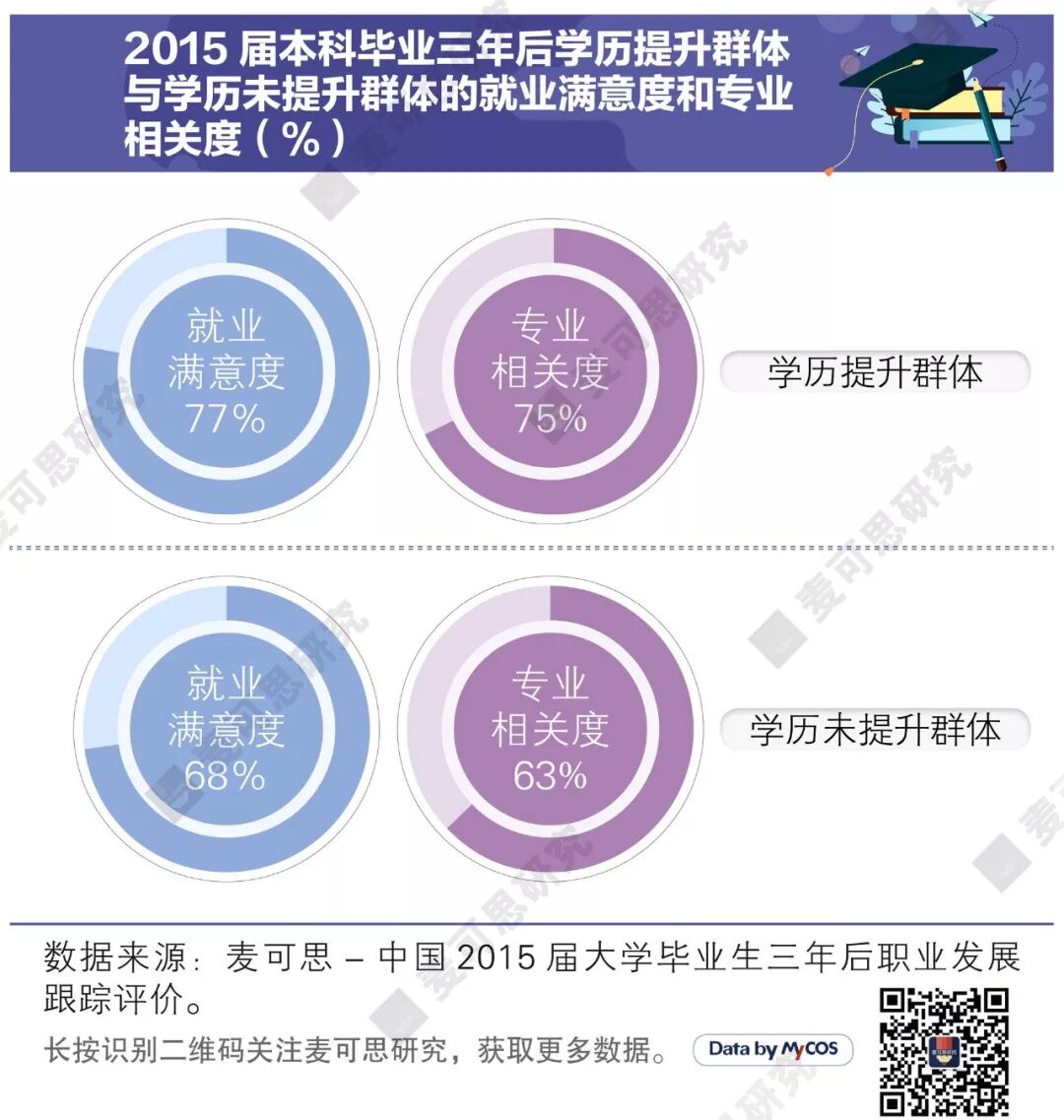 麦可思数据显示,2015届本科毕业三年后学历提升群体(获得国内硕士学历的群体)月收入为7371元,与学历未提升群体月收入相差不大(7419元)。短期来看,学历提升对月收入影响不明显。不过,2015届学历提升群体的“就业满意度”和“专业相关度”分别为77%和75%,分别比学历未提升群体高9个百分点和12个百分点,差别比较明显。整体看来,读研群体就业质量较高。