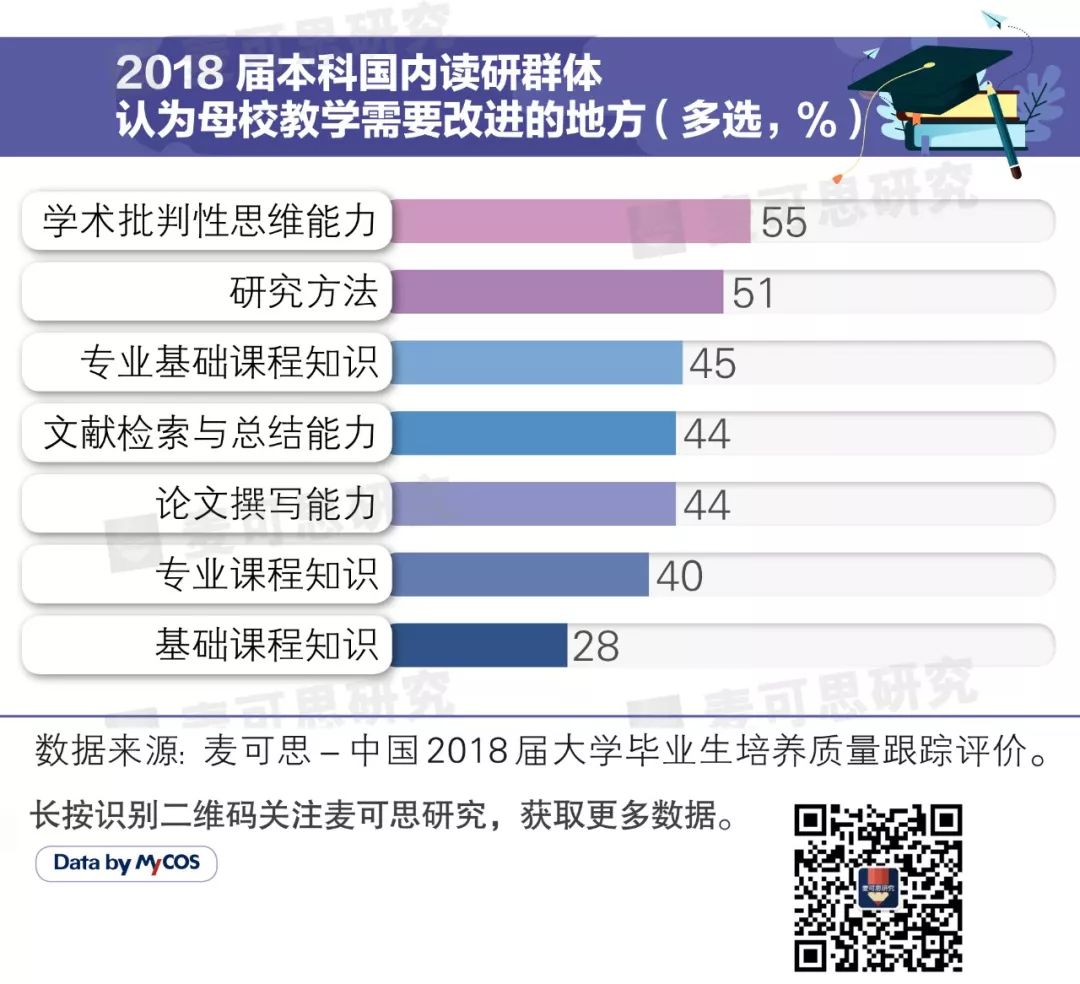 麦可思数据显示,55%的读研本科生认为“学术批判性思维能力”亟待改进,其次是“研究方法”(51%)。