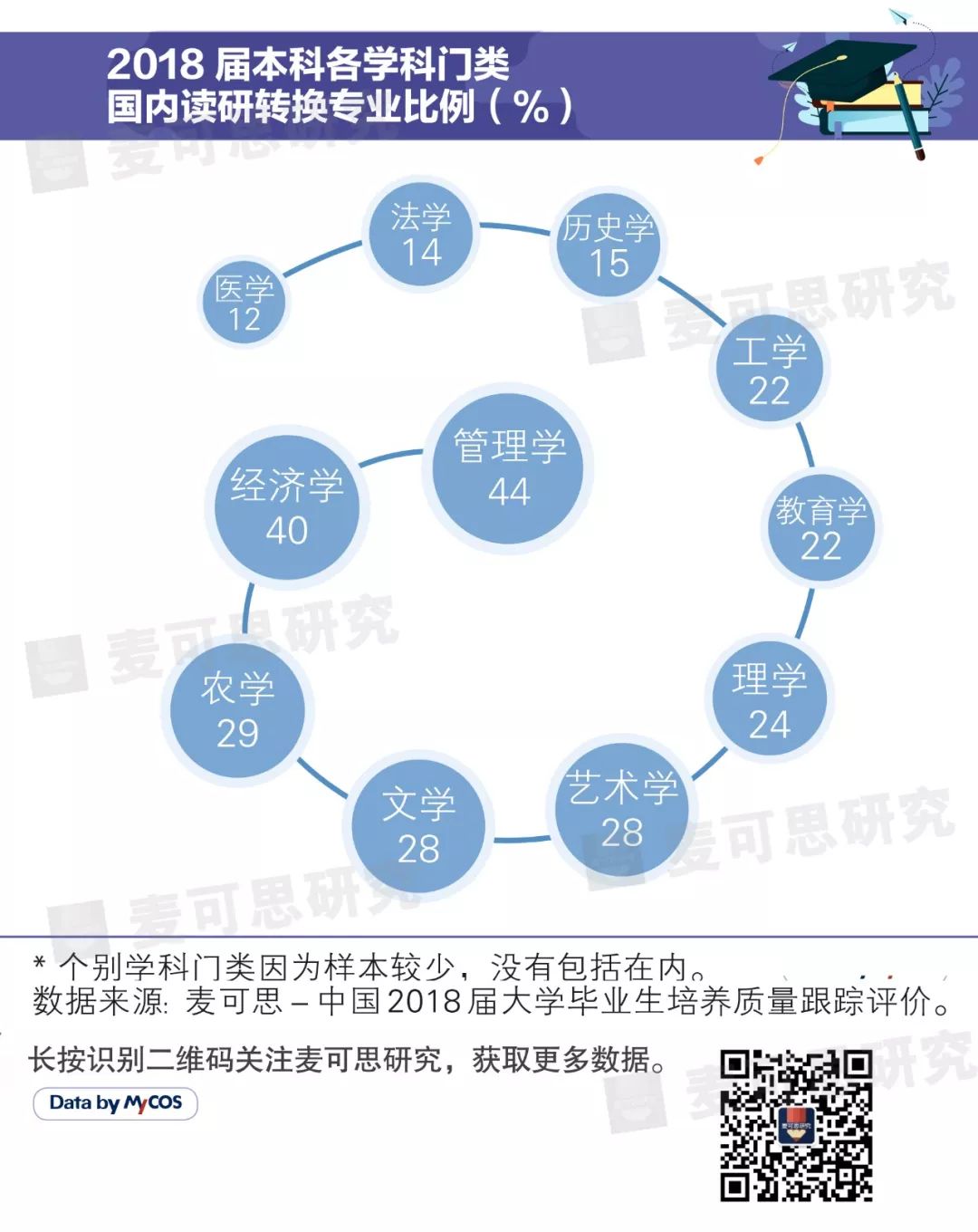 在2018届国内读研的本科毕业生中,有27%的人转换了专业。其中,从学科门类来看,2018届管理学类本科毕业生读研转换专业的比例最高,为44%,经济学类次之(40%)。而国内读研比例最高的医学类毕业生转换专业的比例最低,为12%。