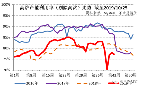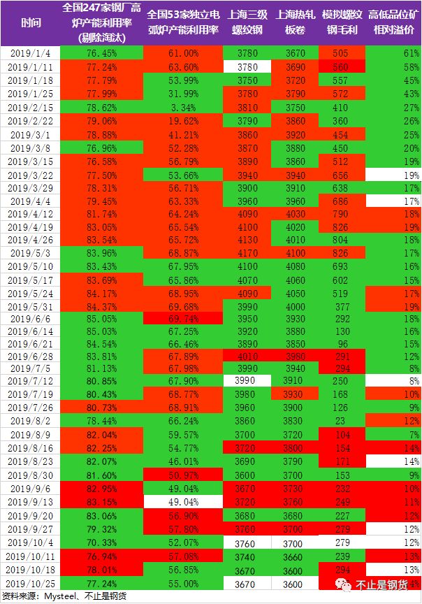 通过观察高低品位铁矿石相对溢价的变化,可以用来判断高炉中废钢添加量的情况,高炉中废钢添加越多,高品位铁矿石消耗越多,即卡拉加斯粉(65%,高品)相对澳大利亚超特粉(56.5%,低品位)溢价越高。自2016年10月以来,随着废钢价格的下跌,高炉中开始逐渐增加废钢的添加量,高低品位铁矿石相对溢价开始上升。截至2019年10月18日,卡粉748元/湿吨,超特粉569元/湿吨,两者的相对溢价为14%,较上周环比增长1%。