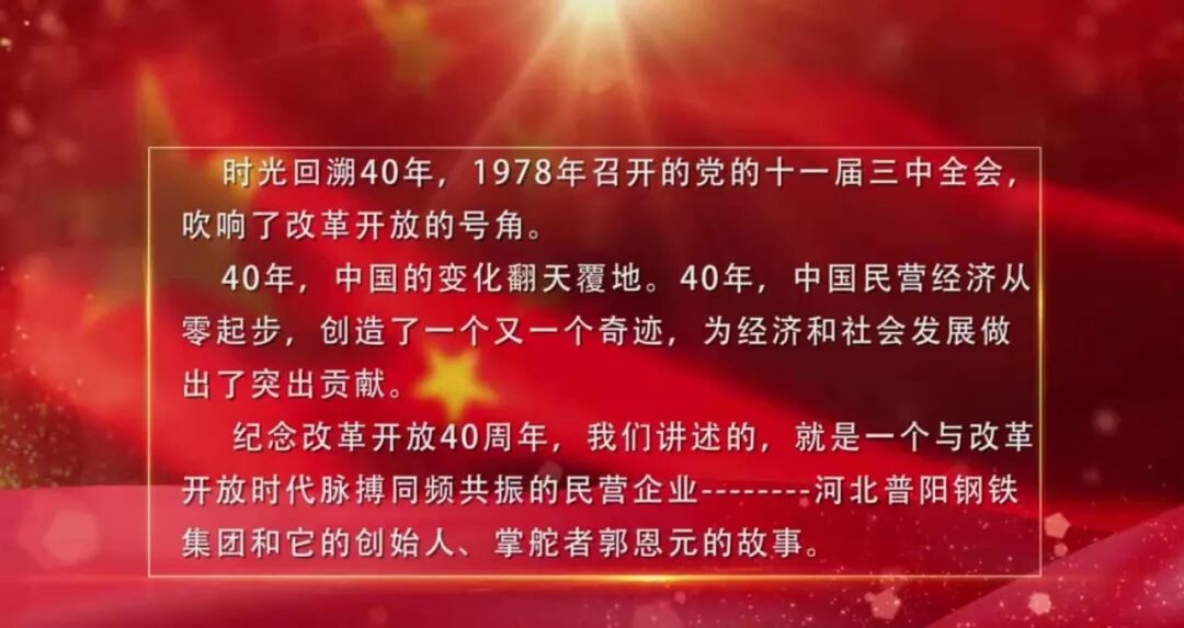 普阳电视专题片——《钢铁报国,君子大成》今天上午9:10在河北都市频道展播,该片全面反映了普阳钢铁集团公司的创业历程、辉煌业绩和慷慨奉献义举,请大家准时收看!