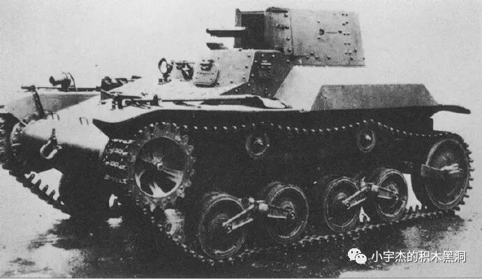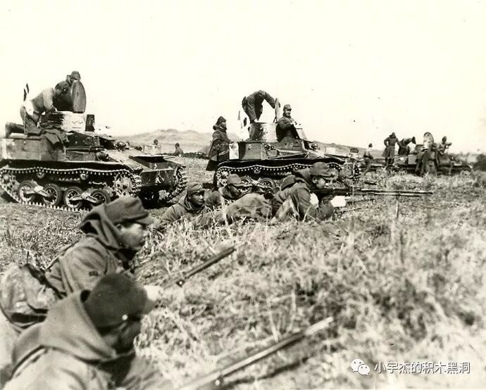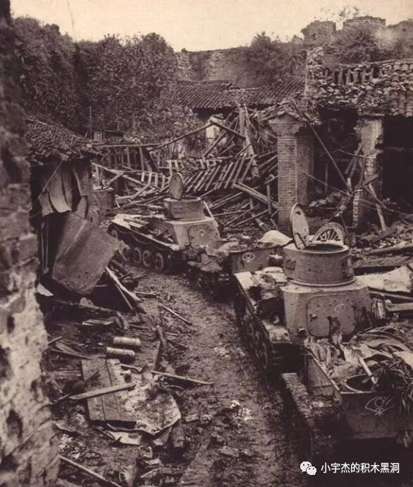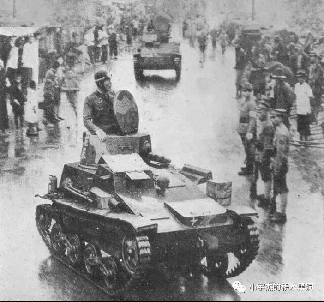 侵华战争期间,入侵中国乡村地区的日军94式轻型坦克,注意每辆坦克的尾部都挂有一辆履带式拖车,用于存放弹药和车辆维护工具。