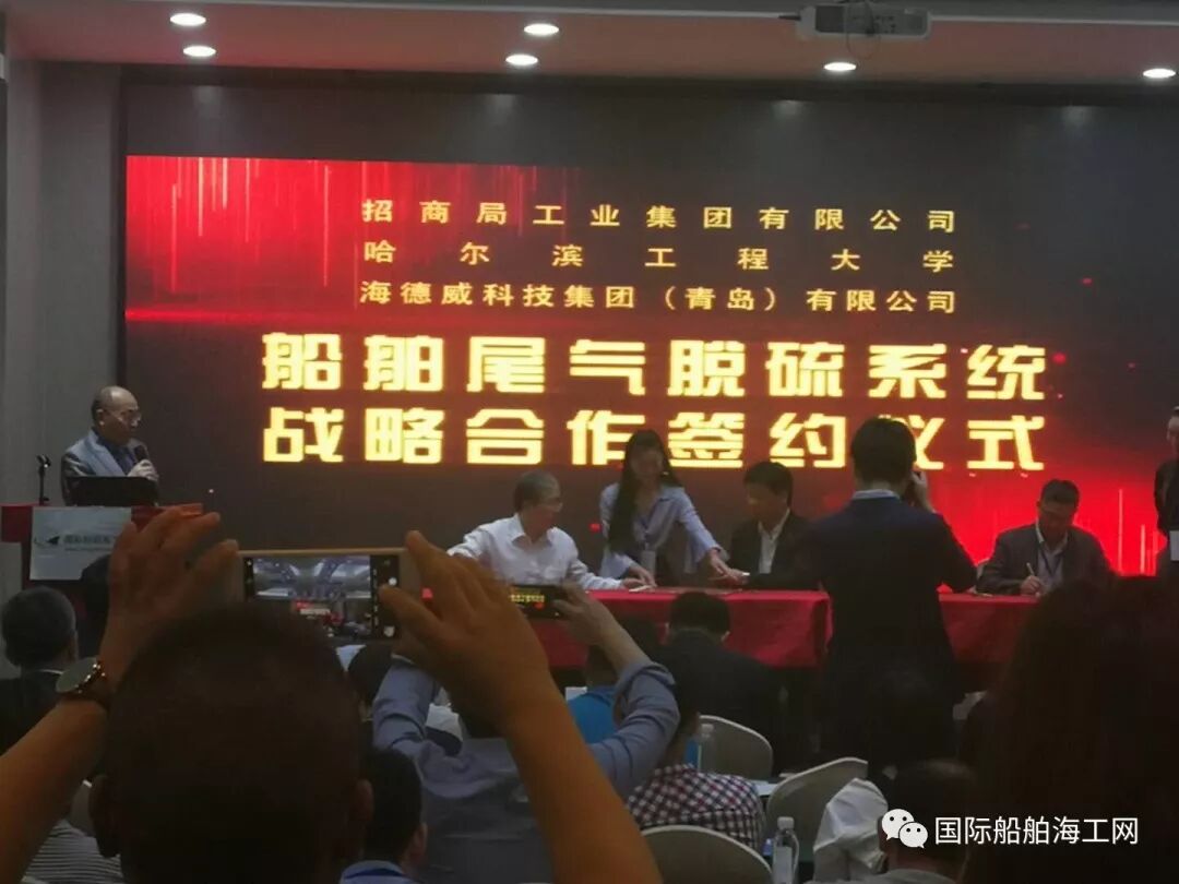 在峰会上,海德威科技集团(青岛)有限公司与招商局工业集团、哈尔滨工程大学在200多名中外船东、船厂、金融投资、船舶服务及业界代表的见证下,成功举办了海洋卫士?船舶尾气脱硫系统产品发布会和战略合作协议签字仪式。招商局工业集团友联船厂总经理朱桂明、哈尔滨工程大学周松教授和海德威科技集团(青岛)有限公司董事长曹学良出席了仪式,并签署了战略合作协议。