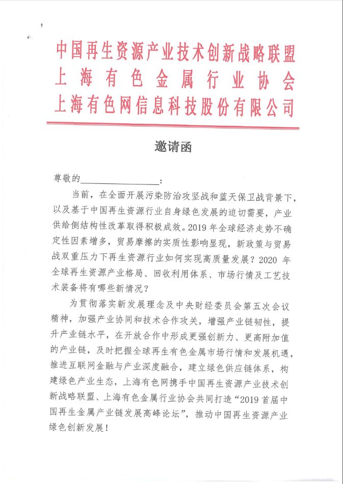 为贯彻落实新发展理念及中央财经委员会第五次会议精神,加强产业协同和技术合作攻关,增强产业链韧性,提升产业链水平,在开放合作中形成更强创新力、更高附加值的产业链,及时把握全球再生有色金属市场行情和发展机遇,推进互联网金融与产业深度融合,建立绿色供应链体系,构建绿色产业生态,上海有色网携手中国再生资源产业技术创新战略联盟、上海有色金属行业协会共同打造“2019首届中国再生金属产业链发展高峰论坛”,推动中国再生资源产业绿色创新发展!