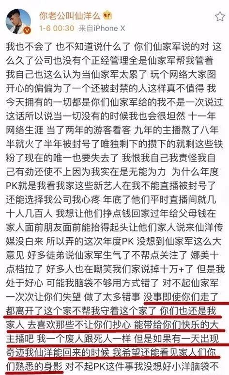 凌晨仙洋发长文向粉丝道歉,并落泪大哭..