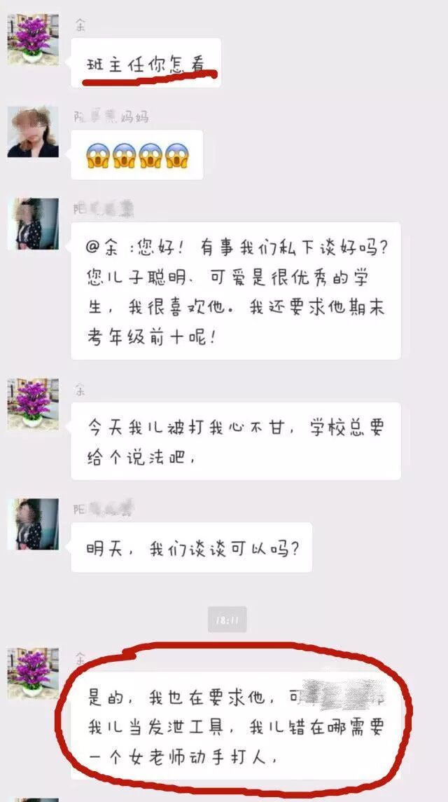 一来就开始问老师,是不是老师可以打学生的谁规定可以打的,说自己的孩子没有犯天大的事情,还轮不到老师来动手打他,她的孩子不是坏孩子,问班主任怎么看。老师随后便回复了这位家长的话,说自己也很喜欢这位学生的,想和家长私聊,不想在家长群里说这件事情。但是这位家长还是不听,还是在群里继续发泄自己的情绪,还要求要这位老师当着全校的面来道歉。