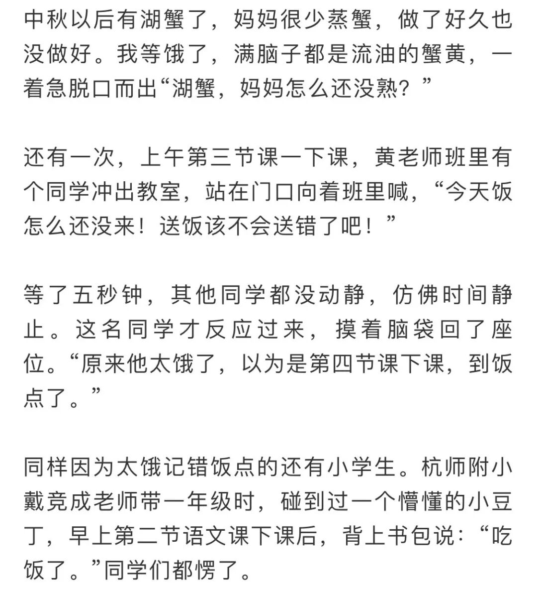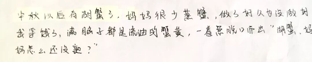 杭州市春蕾中学初二班主任黄海洋告诉记者,上星期学生们的周记交上来,有个小吃货写自己中秋吃螃蟹,等了半天蟹还没蒸好,本来想问:“妈妈,湖蟹怎么还没熟?”但因为满脑子都是流油的蟹黄,嘴巴不听使唤,脱口就是一句——“湖蟹,妈妈怎么还没熟?”(妈妈:这顿湖蟹你别想吃了)