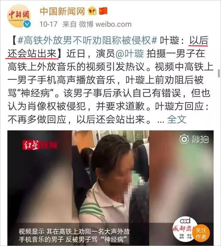 前几天,叶璇在微博上曝光了一个在高铁上外放手机声音的男子,瞬间惹来三千多万人围观。