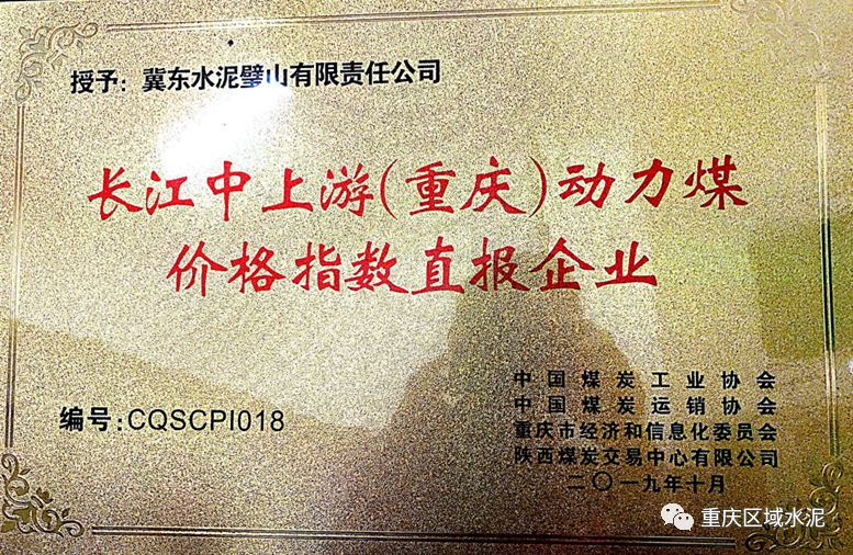 中国煤炭价格指数-长江中上游(重庆)动力煤价格指数(以下简称“重庆指数”)由陕西煤炭交易中心编制发布,得到了中国煤炭工业协会、中国煤炭运销协会、重庆市经济和信息化委员会的支持和参与,于2018年12月5日正式发布。该指数发布以来,真实、准确地反映了重庆区域市场价格变化,为煤炭上下游企业和政府宏观决策提供了依据,已成为了全国煤炭价格指数体系重要的组成部分。 2019年10月16日重庆市经信委、陕西煤炭交易中心、中煤协会及47家重庆地区指数直报企业,在重庆欧瑞锦江大酒店召开长江中上游(重庆)动力煤价格指数2018年-2019年度工作会议,主要议程为2018-2019年度重庆指数运行情况总结,安排部署下一阶段重点工作;重庆指数直报企业授牌;重庆指数采集工作先进工作者进行表彰及专家讲座。 冀东水泥璧山有限责任公司荣获2018-2019年度 “长江中上游(重庆)动力煤价格指数直报企业”称号,谢钒龙同志荣获“重庆指数采集工作先进工作者”称号。