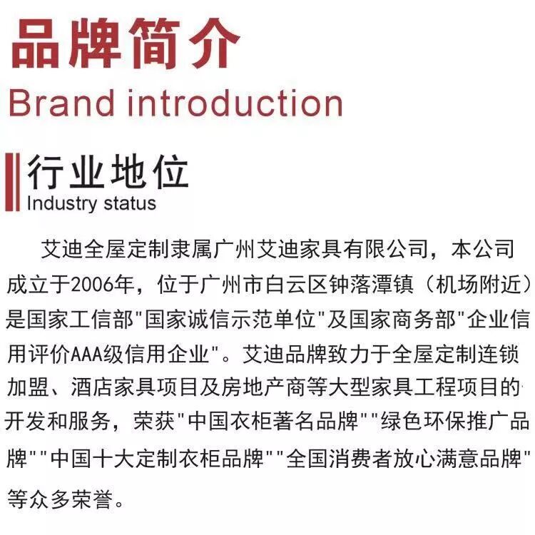 广州市亚丹柜业有限公司成立于2003年3月,是一家集产品研发、设计、生产、销售和服务于一体的大型现代化板式家具定制企业。简约时尚的设计风格,精湛绝伦的生产工艺,深深融入在亚丹人孜孜不倦的品质追求和对天籁般人居文化的理解当中,铸就了亚丹尊贵、典雅、时尚、人文的产品空间内涵,现已开发出整体衣柜、时尚趟门、整体衣帽间、床头柜、书柜、鞋柜、酒柜、儿童家具等8大系列上千个品种的产品。每一款亚丹衣柜,都能满足不同人的奢望。