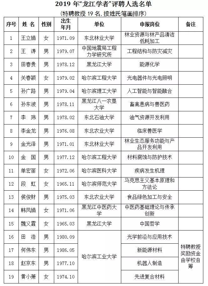 据黑龙江省教育厅官网消息,2019年“龙江学者”评聘人选正式公示。经各高校报名推荐、资格审查、通讯评审和会议评审等程序,最终确定了59人为2019年“龙江学者”评聘人选。