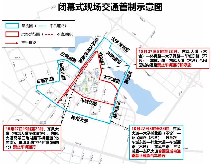 二、10月27日8时至23时,东风大道(不含)—体育路—太子湖路—车城东路(不含)—车城北路—东风大道(不含)合围区域内道路禁止车辆通行和停放。