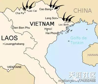 对越自卫反击战,解放军分为东,中,西3路大军越过中越边境发起攻击。其中Cao Bang为高平,Loc Binh为禄平,Lao Cai为老街,Lang Son为谅山,Hanoi为河内,Cha Ba为沙巴。(此图来源:维基 )