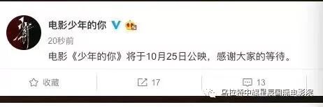 《少年的你》官方微博宣布定档10.25日。影片原定6月27日上映,但在6月24日突然宣布撤档,新档期待定。而早在今年年初,该片曾经入围柏林电影节新生代单元,但随后又突然宣布“因后期制作原因”无法参加柏林影展。
