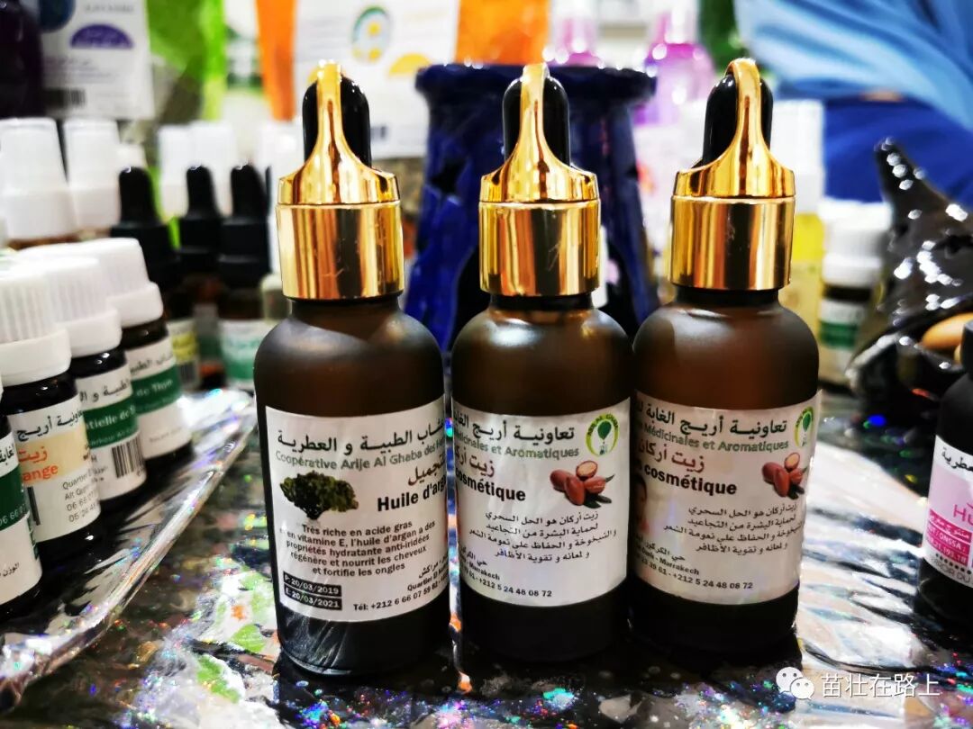 昨天看了住处附近的一个商品博览会,我的朋友跟我说摩洛哥最有特色的产品是精油,问可不可以做代购。我昨天逛博览会的时候倒是看到很多摊位在展示精油,但我不知道这里的精油这么有名,也没有去咨询聊天,因为我本身对这个没有需求。今天下午又去看看,正好要去给昨天拍照的美女送照片,就是昨天游记的封面女郎。可能女性不太愿意留联系方式给男性,所以我答应她今天顺路把照片送过去。巧的是,她的柜台就有精油卖,正好这姑娘的英语特别好,可以好好了解一下这里的精油产品。店里的精油有很多种,比如玫瑰、薰衣草、柠檬草等等。但是在摩洛哥独有的精油,就是这种叫做摩洛哥坚果提炼出来的精油。这种硬壳坚果只产于摩洛哥,而且精油效果特别好,可以用于头发,面部,身体。于是我在朋友圈发了代购的内容,因为今天是博览会的最后一天了,所以代购只有下午短短的几个小时时间。当然在后面旅行的时候也可以买,但是我觉得参加博览会的产品质量应该更有保障些吧。